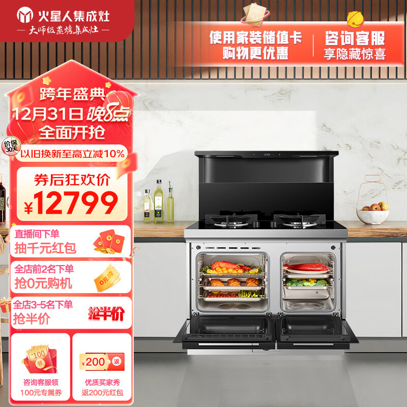 火星人ET30BCZ 集成灶蒸烤一体 左蒸烤炸右快蒸 家用蒸箱烤箱 燃气灶液化气价格:12999.00元!