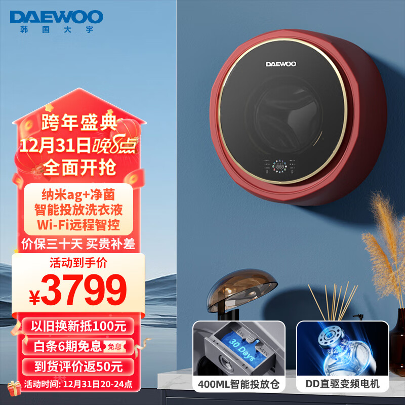 大宇(DAEWOO)壁挂洗衣机 全自动变频3KG滚筒 彩屏WiFi智联 高温煮洗 升级款星云系列 DY-BGX07 赤焰红价格:3999.00元!