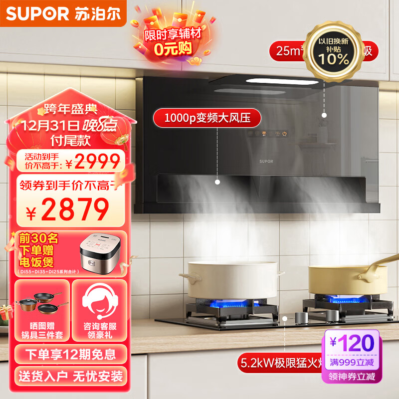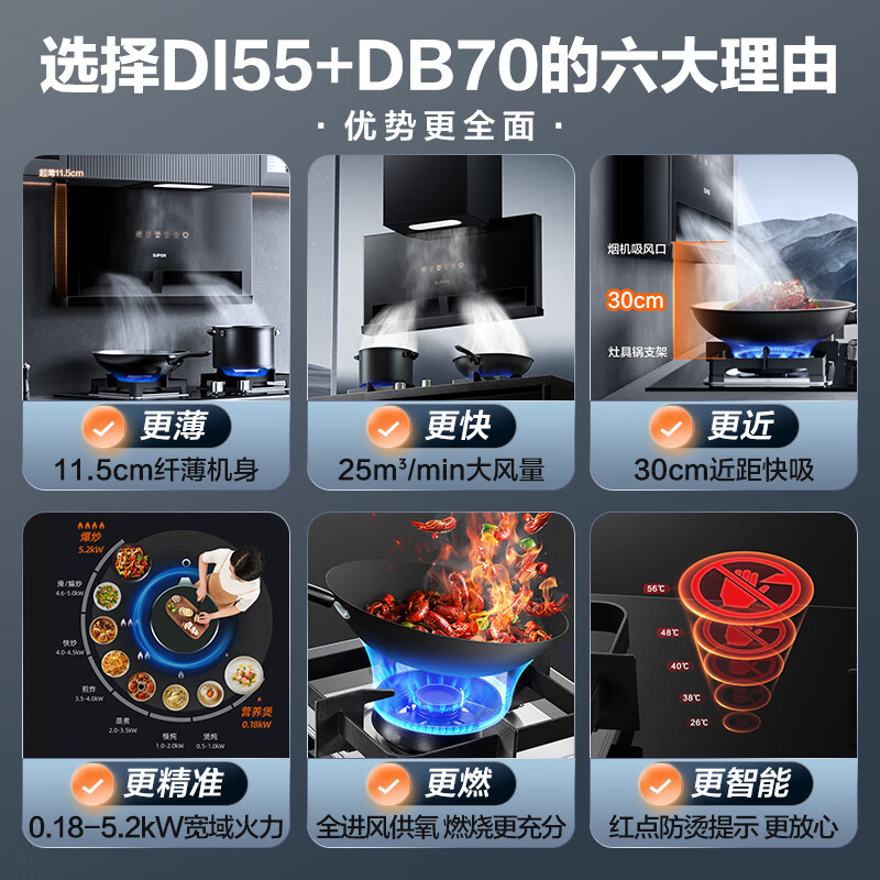 苏泊尔(SUPOR)抽油烟机燃气灶烟灶套装 25立方大吸力 超薄低吸双腔吸烟 1000Pa变频挥手智旋干洗DI55+DB70天然气价格:3298.00元!