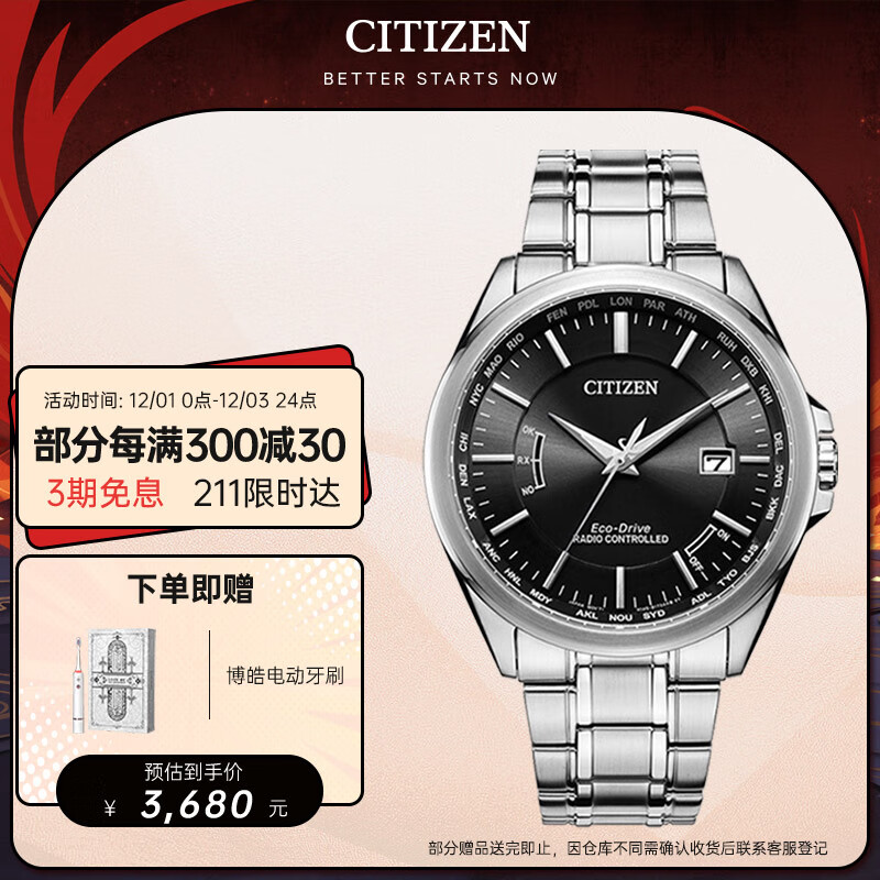 西铁城(CITIZEN)手表男日韩表空中之鹰光动能电波钢带商务礼物CB0250-84E价格:3690.00元!
