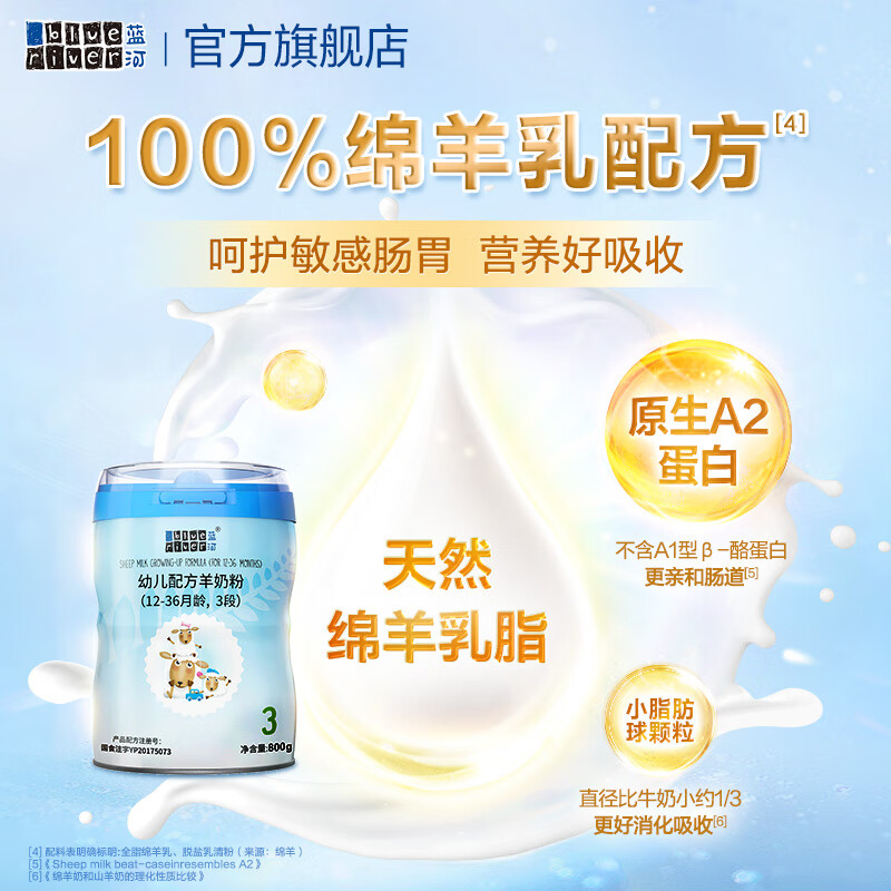 5、无数次回购的产品了,两个孩子都爱喝,绵羊奶,营养更高,更好吸收,现在出了新国标版的蓝河,老款更具有性价比一些,京东自营有保障!