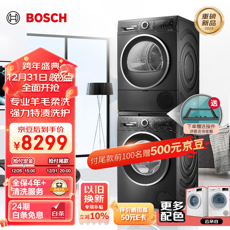 博世(BOSCH)洗烘套装10+10KG【珍珠黑】大容量全自动滚筒洗衣机家用烘干机专业羊毛柔洗特渍洗护152U2A+252U2A价格:9699.00元!