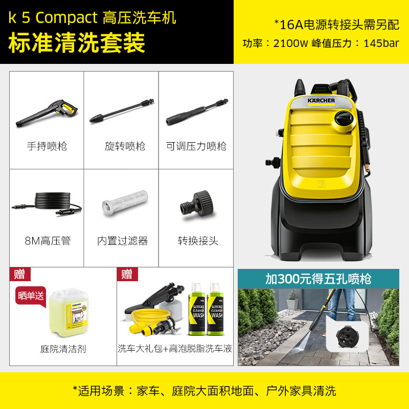 真的要说KARCHERK5 Compact是我喜欢的外观,质量还不错,水*威力大,清洗效果好,清洗庭院污垢很好使,平时洗洗车会很省功夫。