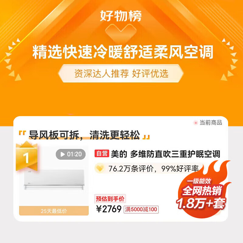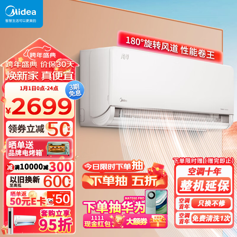 美的(Midea)空调挂机大1匹 新一级变频冷暖壁挂式大风口环绕风节能智能家电以旧换新 风尊时尚版价格:2699.00元!