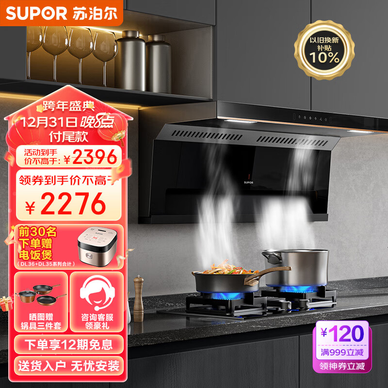苏泊尔(SUPOR)抽油烟机 双腔拢烟顶侧双吸油烟机灶具套装 24立方大吸力变频烟灶 家用油烟机燃气灶 DL35+DB28液价格:2495.00元!