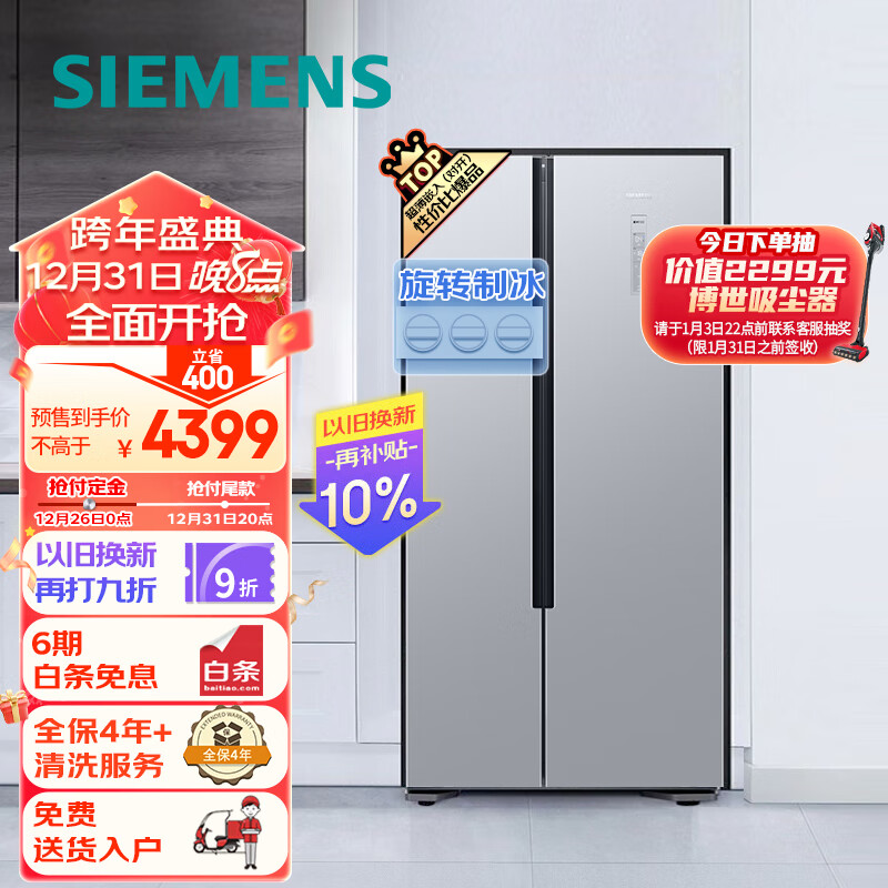 西门子(SIEMENS) 500升变频无霜冰箱双开门对开门大容量家用超薄嵌入式旋转制冰银色以旧换新KX50NA41TI价格:4799.00元!