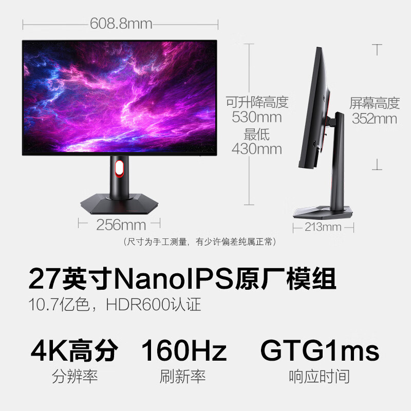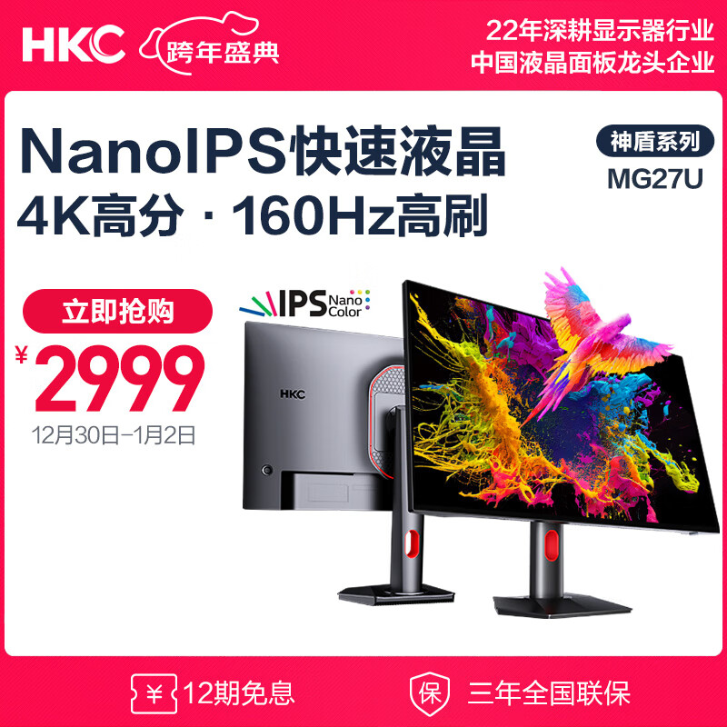 HKC 27英寸 Nano IPS屏幕 4K高清 160Hz超频 10.7亿色 HDR600 四边微边框 旋转升降电竞屏 显示器 神盾MG27U价格:4299.00元!