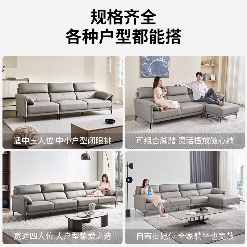 4、左右沙发没毛病,大气时尚的外观以及灰色的高级配色,简约而不简单,纯头层牛皮打造,手感细腻光滑,多档可调节头枕,高脚设计,完美!