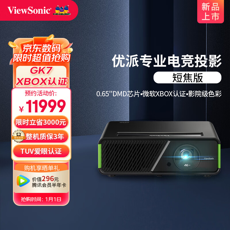 优派 GK7 4K投影仪家用 短焦投影机 家庭影院 手机投影 智能电视(微软Xbox认证 0.65DMD芯片 TUV护眼认证)价格:14999.00元!