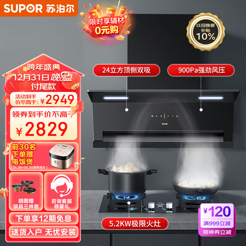 苏泊尔(SUPOR)抽油烟机 顶侧双吸油烟机灶具套装 24立方大吸力烟灶套装 家用油烟机燃气灶套装 DL36+DB70液化气价格:3148.00元!