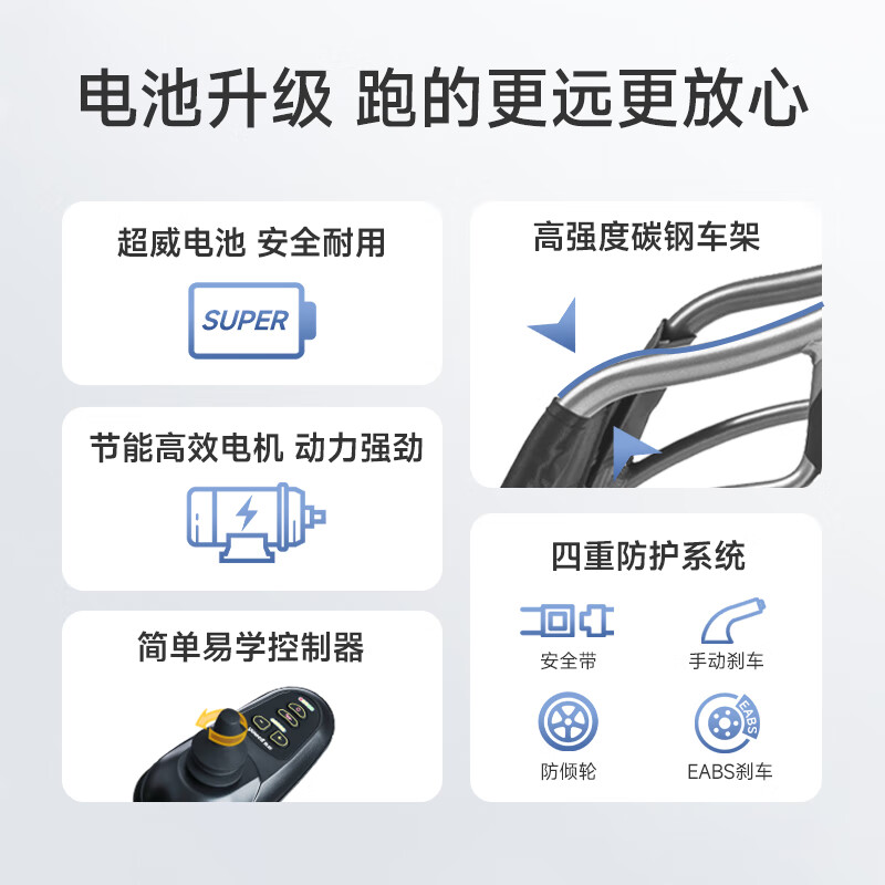 2、鱼跃医疗的产品,质量是让人放心的。刚好京东618活动,价格非常的实惠。这款电动轮椅,包?b和做工都很细致,质量非常可靠。锂电池的续航能力也能够满足老人的日常出行需求。充电充满可以走十多公里。老人家非常喜欢,终于可以自己行动了。好评!