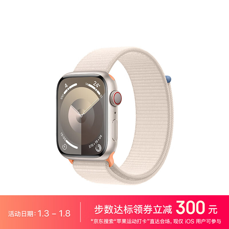 Apple Watch Series 9 智能手表GPS+蜂窝款45毫米星光色铝金属表壳星光色回环式表带电话手表S9 MRP43CH/A价格:3999.00元!