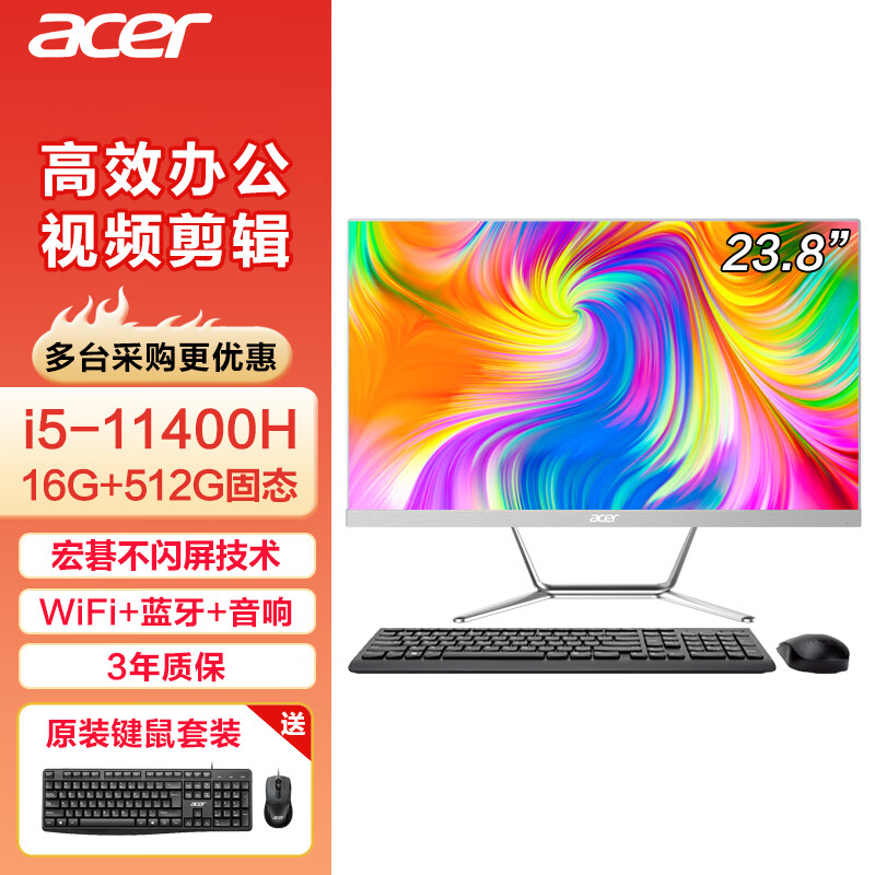 1、第二次买宏碁的一体机了,这次的是11400h的cpu,16g运行内存+512g的固态,下单第二天就到了,真的很快,底座很牢固的,也送了键盘鼠标,开机直接用!