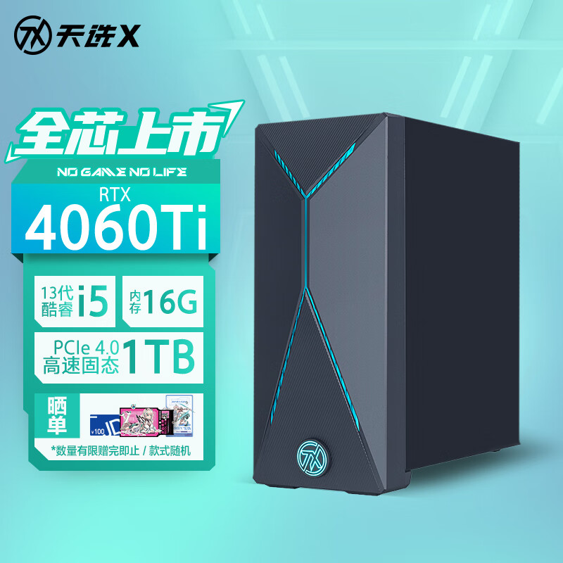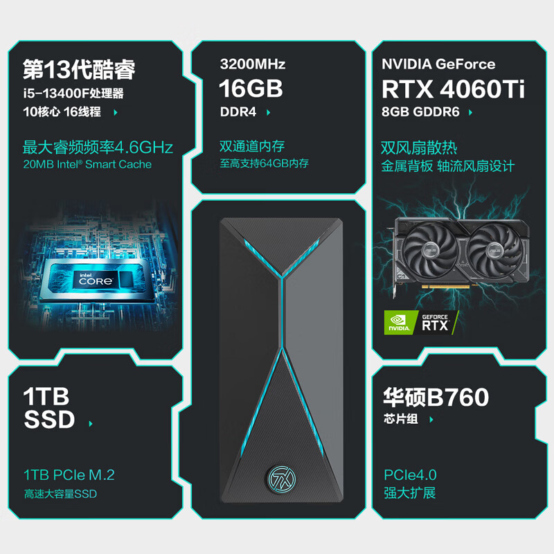 华硕天选X 2023 游戏电竞台式机电脑主机设计师电脑(13代i5-13400F RTX4060Ti 8GB显卡 16G 1TB SSD WiFi6)价格:6499.00元!