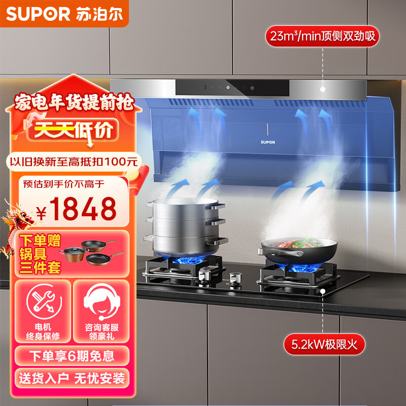 苏泊尔(SUPOR)抽油烟机 顶侧双吸7字型烟灶套装23立方挥手免拆洗家用烟机燃气灶具套装DL11+DB27液价格:1848.00元!