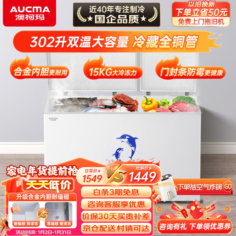 澳柯玛(AUCMA)302升 冰柜家用双温双箱商用家用大容量冰柜卧式冰柜囤货冷柜冷藏全铜管BCD-302CNE以旧换新价格:1549.00元!