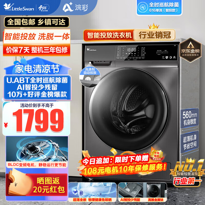 小天鹅(LittleSwan)10公斤滚筒洗衣机全自动 智能投放 浣彩系列 紫外线除菌 超薄机身 TG616-T1B价格:1759.00元!