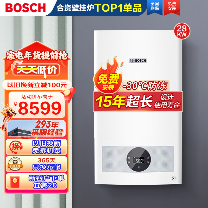 博世BOSCH 一级低噪燃气壁挂炉天然气地暖恒温洗浴热水两用炉热水器博乐G5100WE 28 CG(150-200㎡)价格:8599.00元!