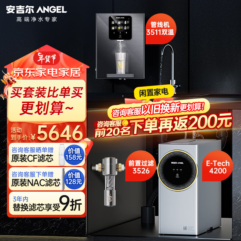 安吉尔净水器家用全屋净热套装前置过滤器管线机直饮RO反渗透E-Tech4200+前置3526+3511双温价格:5646.00元!