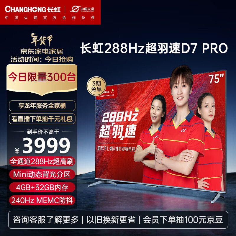 长虹电视75D7 PRO 75英寸288Hz游戏电视 Mini动态背光杜比音画 MEMC 4K智能平板液晶LED电视机以旧换新价格:3888.00元!