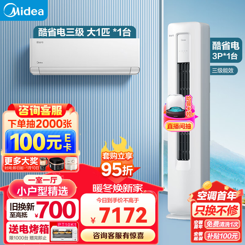 美的(Midea)新能效 酷省电 空调套装 一室一厅 小户型精选(大1匹酷省电+3匹酷省电)价格:7548.00元!