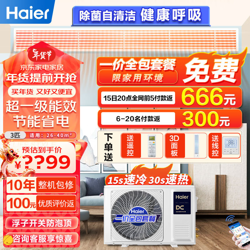 海尔(Haier)中央空调风管机一拖一家用客厅3匹变频新一级能效KFRd-72NW/72ECA81U1 标配控制器套餐+3D面板价格:7699.00元!