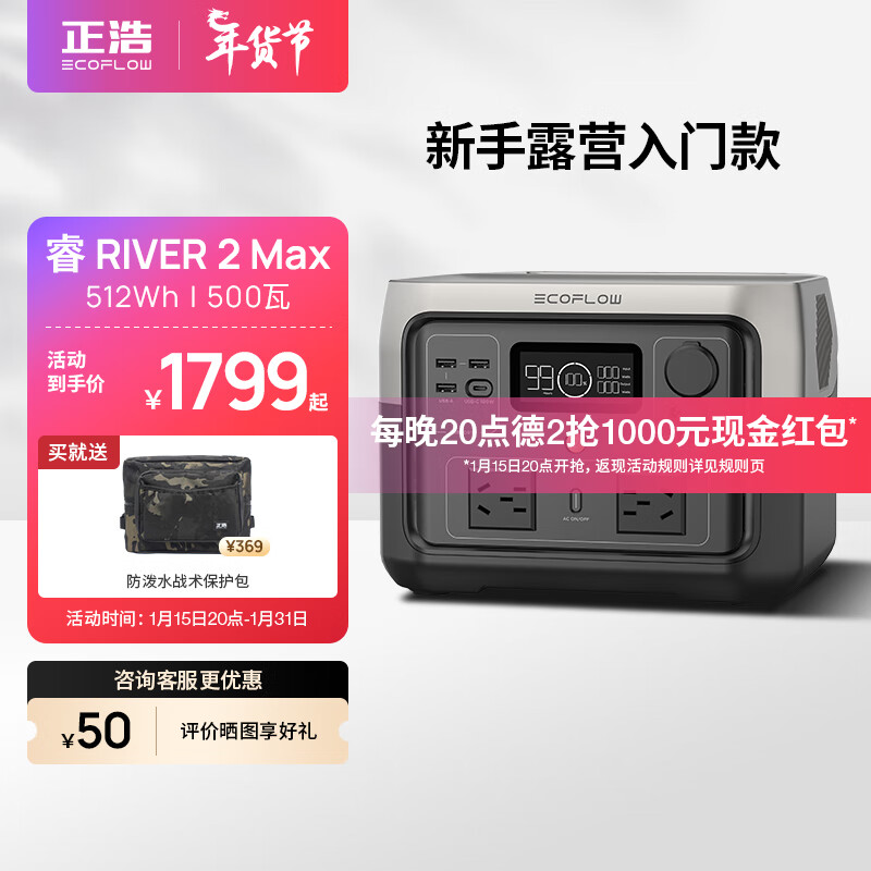 ECOFLOW正浩【磷酸铁锂】快充移动户外电源220V 500W自驾露营便携停电应急备用笔记本充电宝512Wh价格:1999.00元!