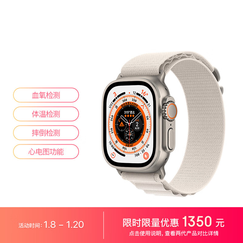 Apple/苹果 Watch Ultra 智能手表GPS+蜂窝款 49毫米 钛金属表壳星光色高山回环式表带小号eSIM健康手表MQFA3CH/A价格:4949.00元!