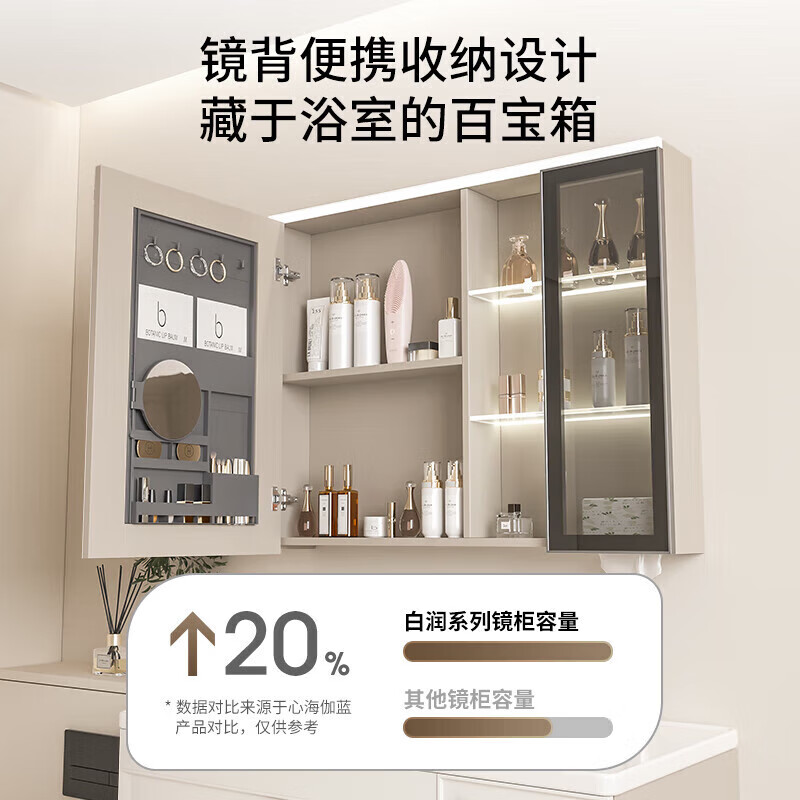 4、特地买了奶呼呼的颜色为的是和我们家墙面配色,挺灵光的。开放格可以开关发光挺实用的,镜背后还有一个小镜子可以放很多东西,美妆放东西挺多。