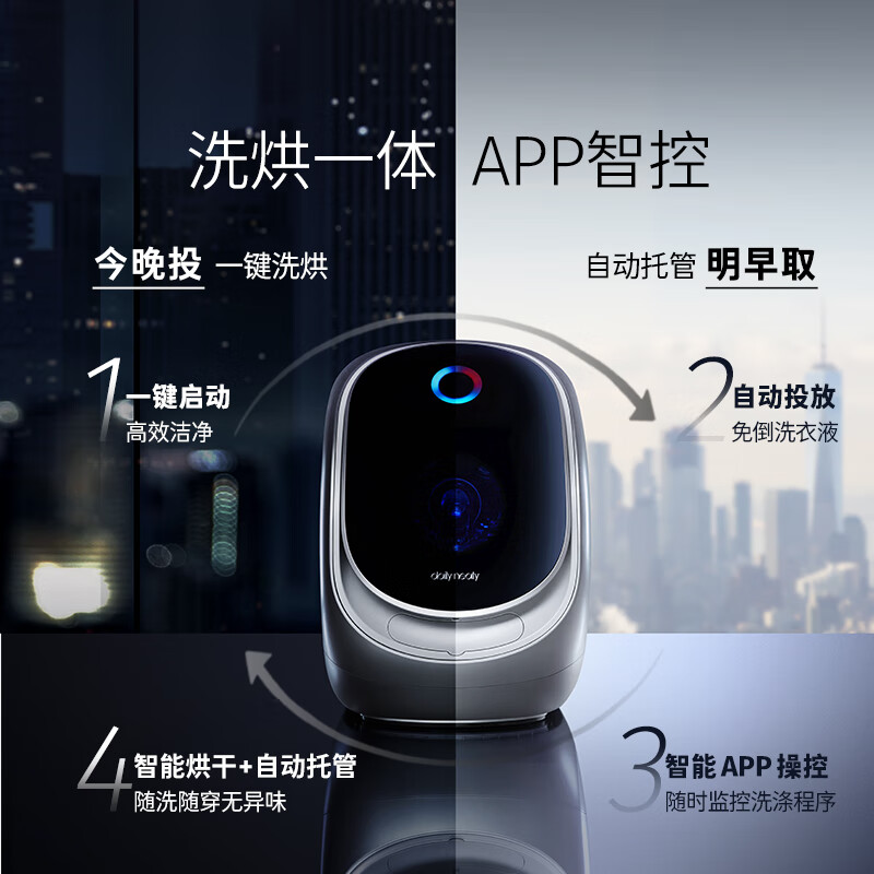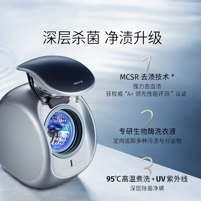 3、外形外观:科技感非常强,颜值无可挑剔洗净效果:很干净,全自动洗烘,省心,还可以app控制除菌效果:有专用的除菌洗衣液,实测100%容量大小:一天的内衣物刚好,声音非常安静,这个点赞