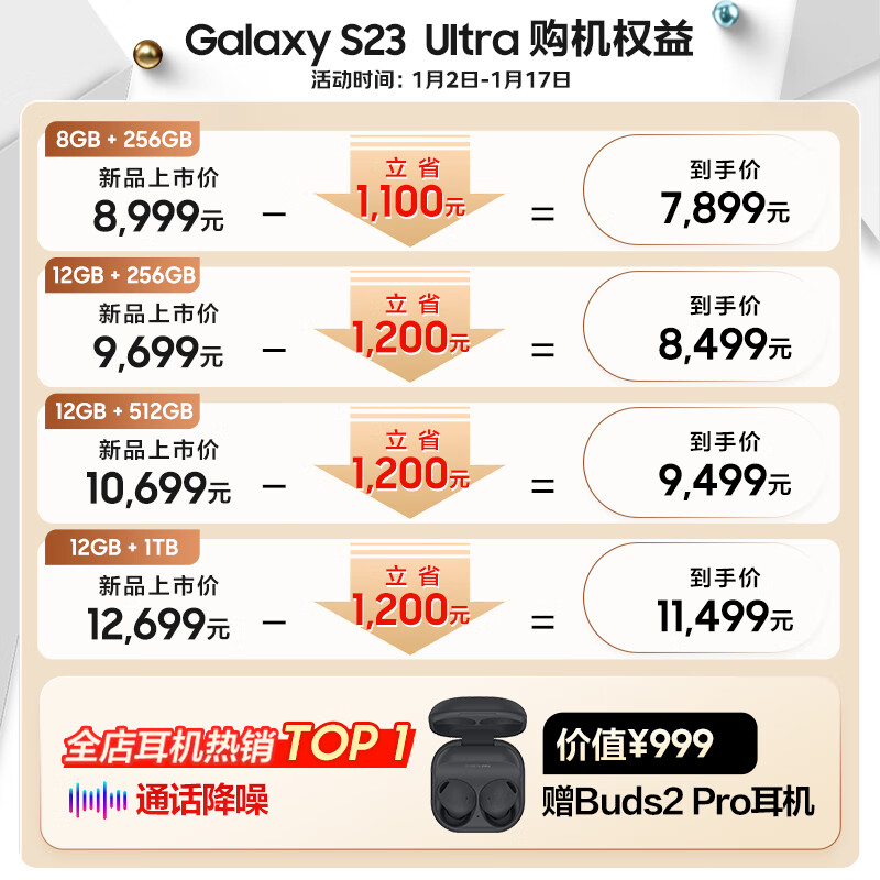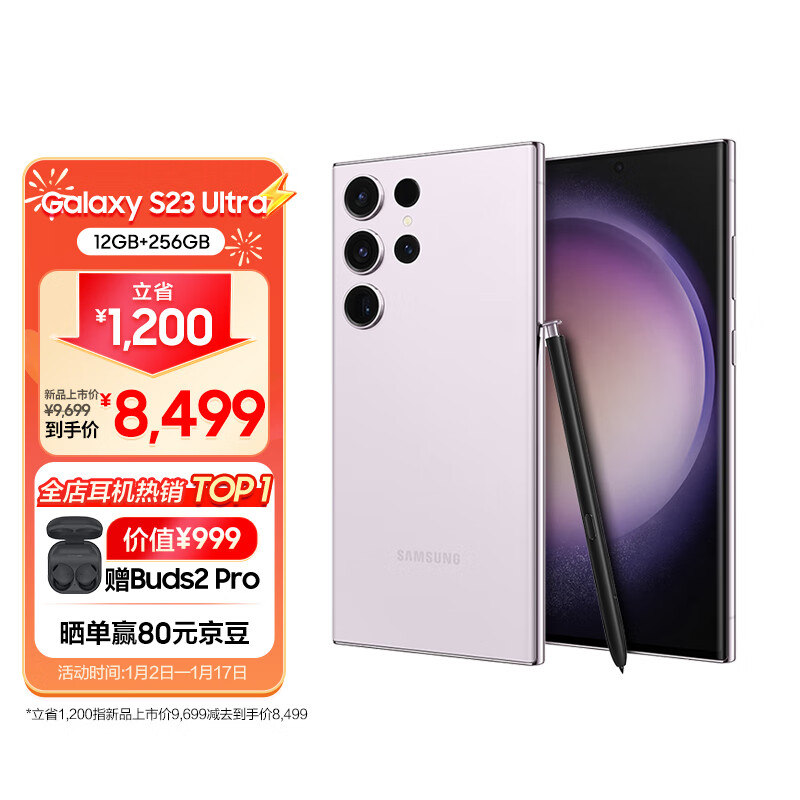 三星 SAMSUNG Galaxy S23 Ultra 2亿像素 第二代骁龙8移动平台 大屏S Pen书写 12GB+256GB 悠雾紫 5G游戏手机价格:8499.00元!