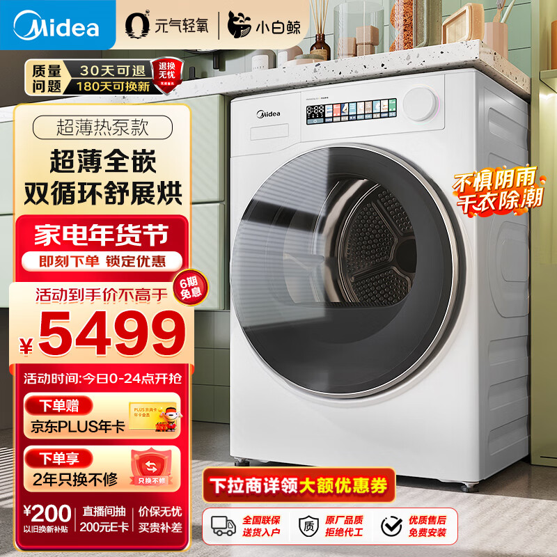 美的(Midea)10KG热泵式烘干机家用 超薄大筒径 小白鲸系列 分级除菌 除螨除潮 毛屑收集 1:1正反转MH100WJ3 价格:5499.00元!