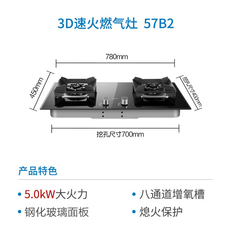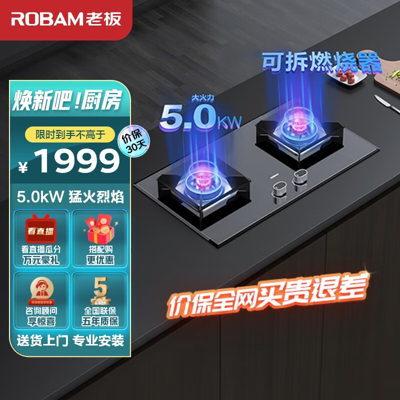 老板(Robam)JZT-57B2家用钢化玻璃面板 易打理嵌入式燃气灶 高热效猛火灶5.0kW 天然气灶具灶台换灶选老板价格:1999.00元!