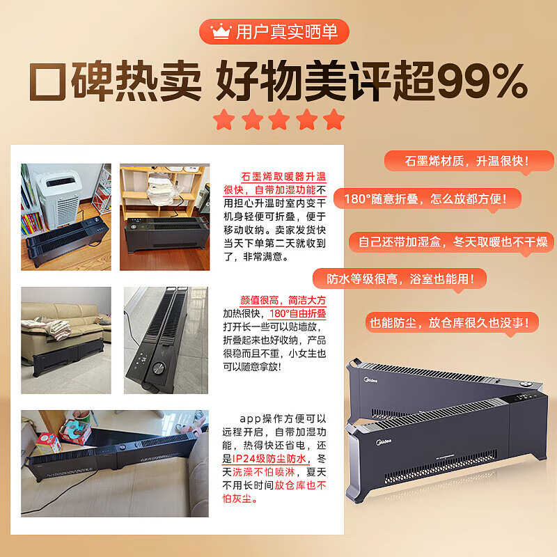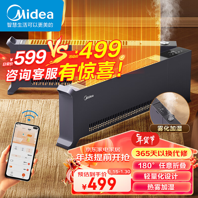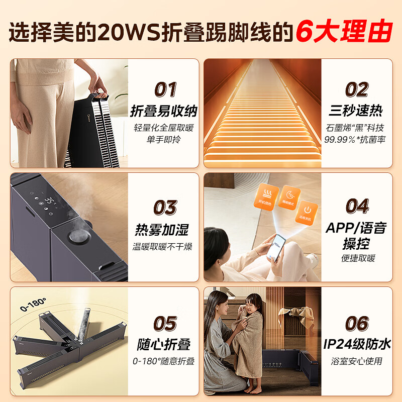 美的(Midea)【超薄折叠加湿】石墨烯踢脚线/取暖器家用/电暖器/电暖气家用/移动地暖/智能热雾加湿HDU20WS价格:776.00元!