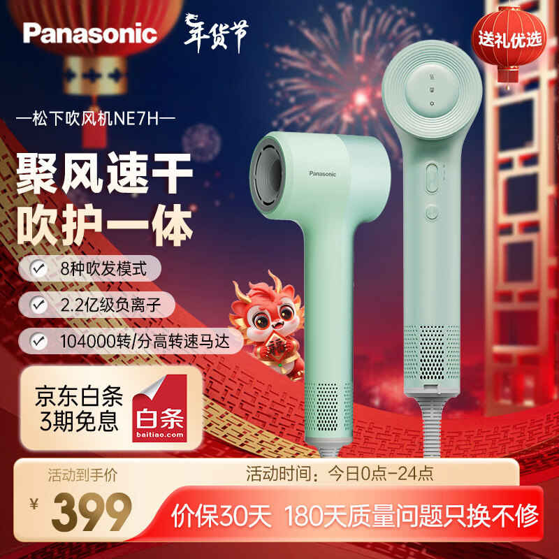 松下7H缤纷筒 高速吹风机 大风力吹头发 负离子电吹风速干护发 家用吹风筒 生日新年礼物送女生女友 NE7H缤纷筒|莫奈绿价格:399.00元!