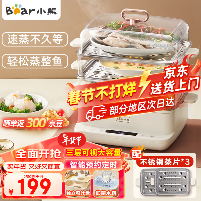小熊(Bear)电蒸锅 蒸锅家用 可视电蒸箱 多功能早餐蒸鱼三层大容量蒸笼 不锈钢蒸盘 DZG-CA2G2价格:198.00元!