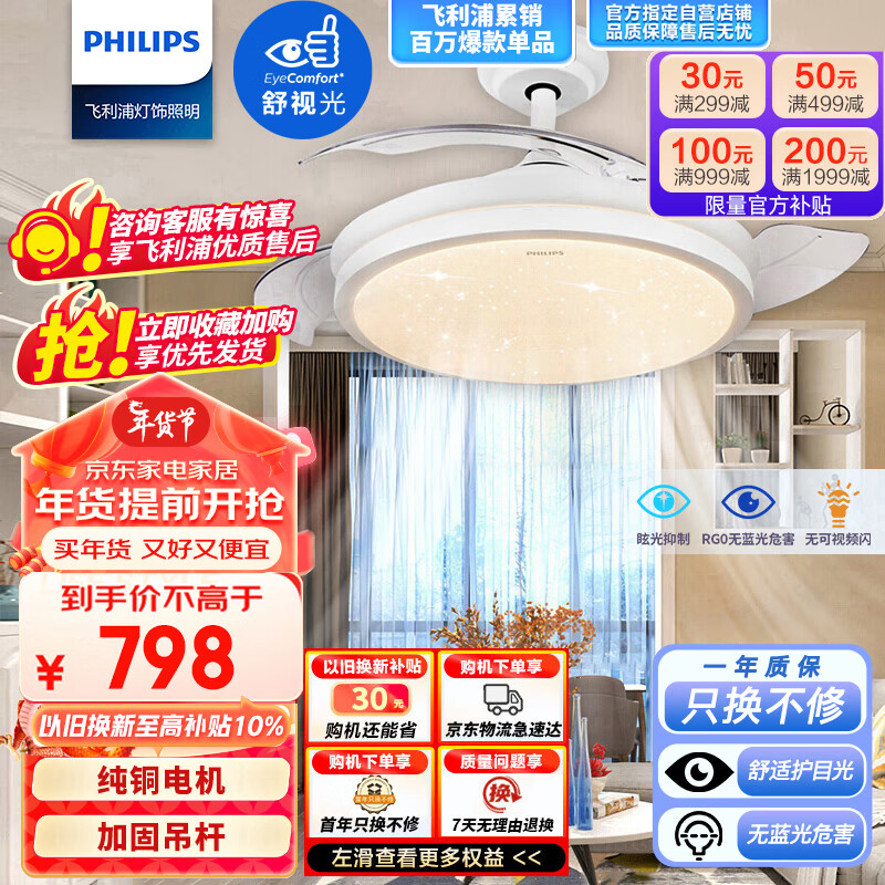 飞利浦led风扇灯吊扇灯吊灯餐厅卧室客厅简约带遥控调色48W+36W悦灵价格:1098.00元!