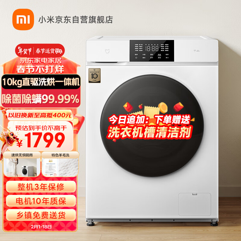 米家小米出品10kg简白洗烘滚筒洗衣机全自动 微蒸空气洗除菌 智能烘干直驱电机节能低噪 XHQG100MJ101价格:1798.00元!