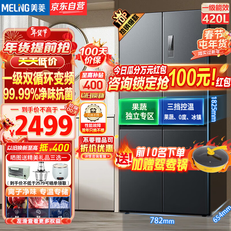 美菱(MeiLing)420升十字对开冰箱四开门家用一级风冷无霜大容量节能双变频双循环系统电冰箱 BCD-420WP9CX典雅灰价格:2599.00元!