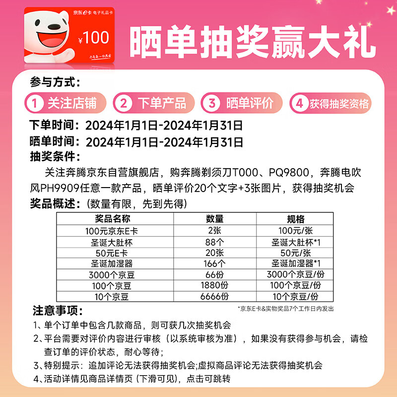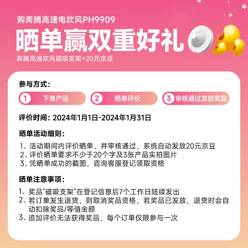 3、活动囤货的,价格实惠超值,奔腾吹风机1400W,平时在屋企使用,或者外出旅游都好实用,风力足。不错不错,棒棒哒!快递也很快,隔天就到啦!