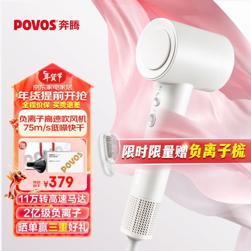 奔腾(POVOS)吹风机家用电吹风筒新一代大功率高速吹风机负离子大风力速干低噪音 PH9909珍珠白礼盒装新年礼价格:579.00元!