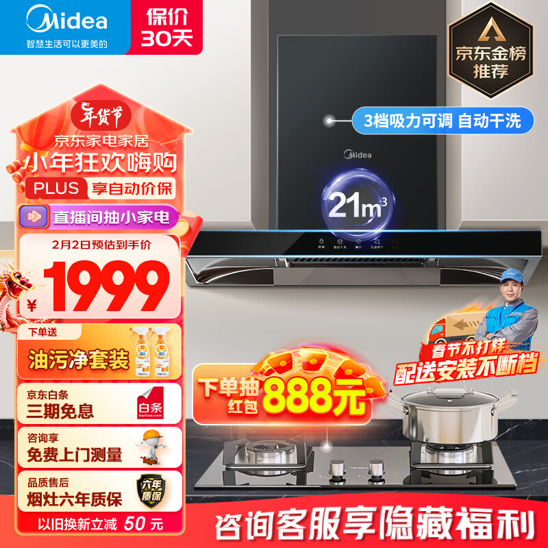 美的抽油烟机灶具套装21大吸力自动清洗吸烟机燃气灶套装T201+Q330天然气价格:1999.00元!