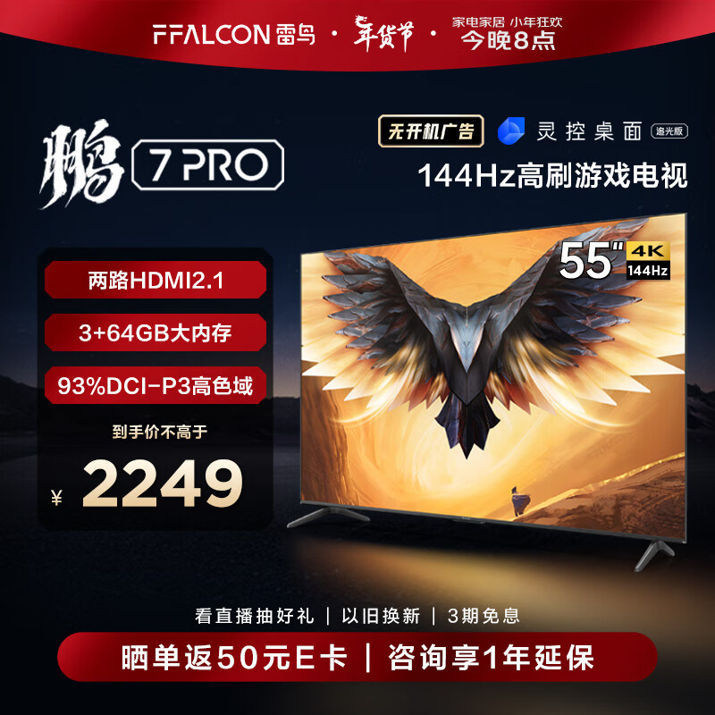 FFALCON雷鸟 鹏7PRO 55英寸游戏电视 144Hz高刷 HDMI2.1 4K超高清 3+64GB 超薄液晶平板电视机55S575C价格:2249.00元!