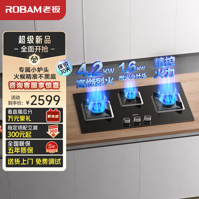 老板(Robam)燃气灶液化气灶 嵌入式猛火灶家用钢化玻璃面板灶具灶台4.2kW可拆卸易清洁三眼灶JZY-39B1A价格:2599.00元!