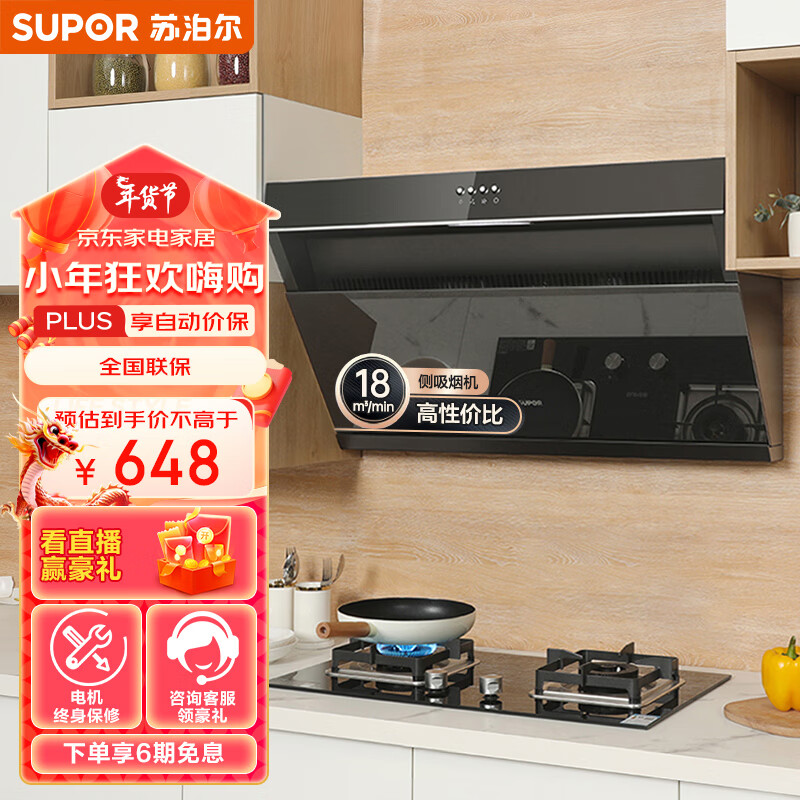苏泊尔(SUPOR) 抽油烟机 家用小尺寸大吸力 18立方侧吸式吸油机小户型老式厨房脱排油烟机 DJ13价格:648.00元!