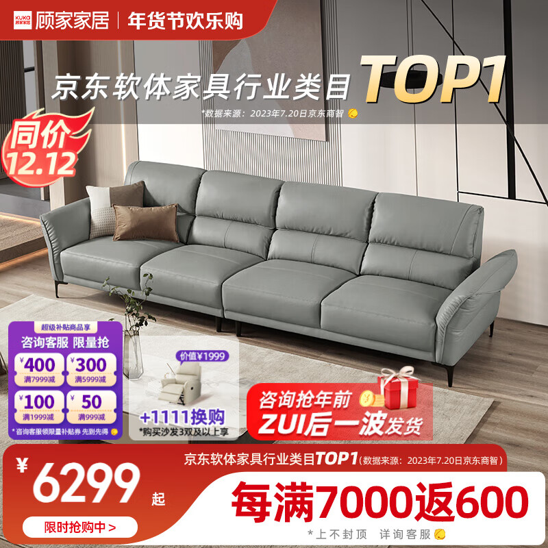 顾家家居(KUKA)头层牛皮沙发客厅翻折扶手羽毛靠头1202【松烟灰】四人位价格:6299.00元!