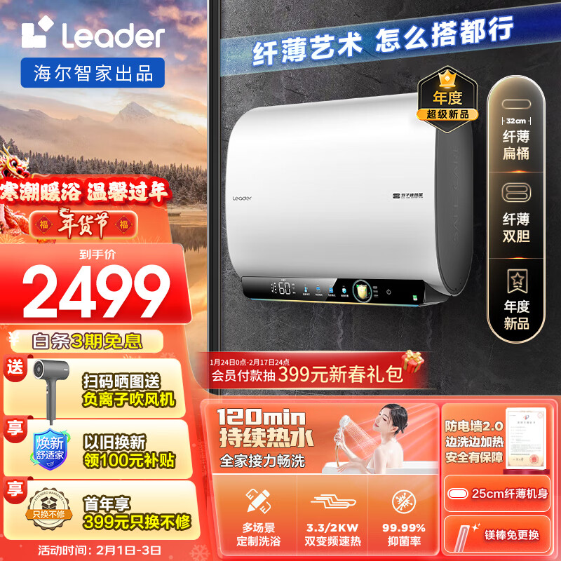 海尔智家出品 Leader电热水器80升小仙镜扁桶3300W一级能效镁棒免换 纤薄双胆 LEC8003HD-F5白U1价格:2699.00元!