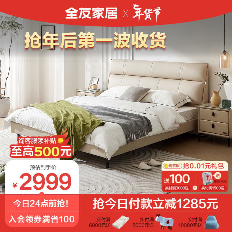 全友家居 现代简约头层牛皮双人床1.8米主卧分段靠包真皮软床116033价格:4284.29元!