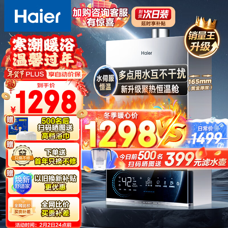 海尔(Haier)16升燃气热水器天然气 双核无极水伺服恒温 ECO节能 多重安防 智能防冻JSQ30-16MODEL3DPWCU1价格:1498.00元!