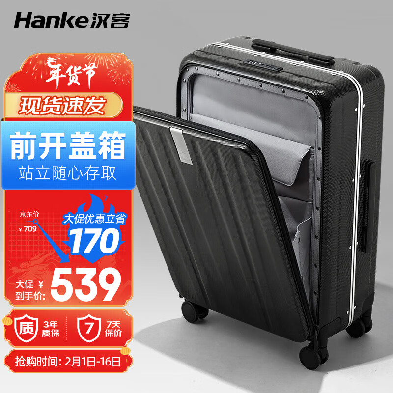 汉客铝框箱前开盖行李箱男拉杆箱女旅行箱大容量24英寸墨玉黑密码箱价格:709.00元!